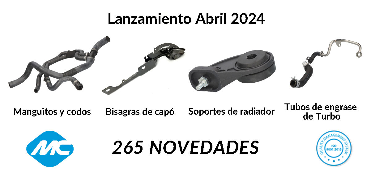 Este es el tercer lanzamiento consecutivo en el que manguitos y codos es la familia con mayor número de referencias, presentándose en esta ocasión 107 nuevas. Otras familias con gran protagonismo son latiguillos de freno, que sigue aumentando con 12 códigos más; tubos de engrase de turbo, que con 10 novedades ya alcanza en total las 179 referencias; y bisagras de capó, de las que solo había una en catálogo y ahora se añaden 10 nuevas.
